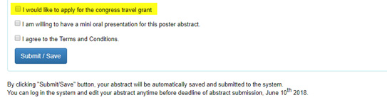 - Must submit an abstract, and tick the checkbox “I would like to apply for the congress travel grant” by the end of the abstract submission page (shown below).